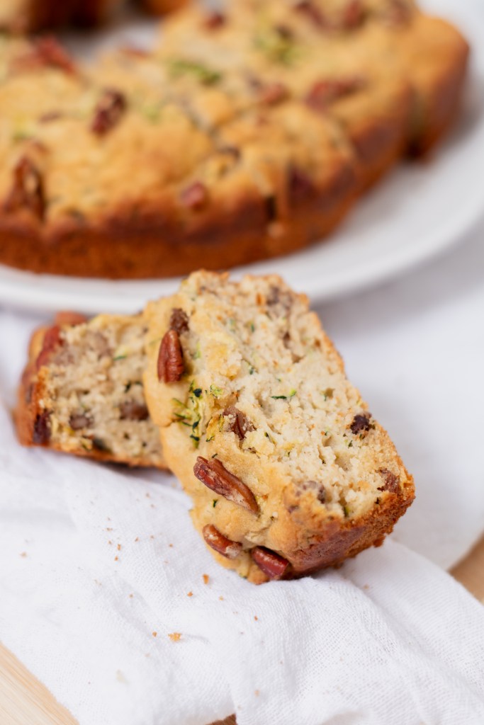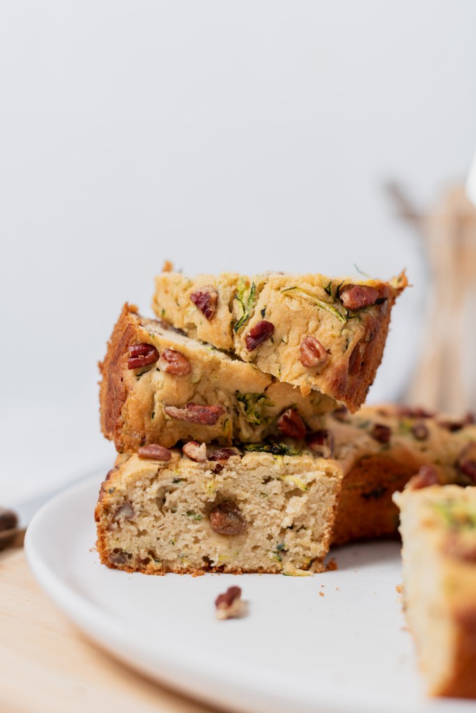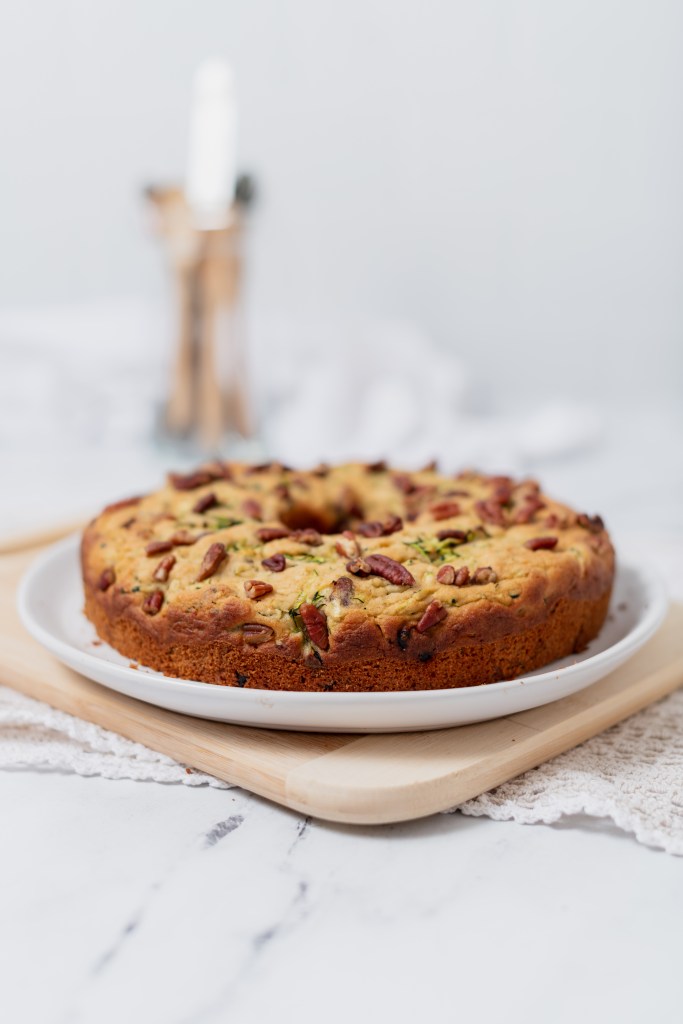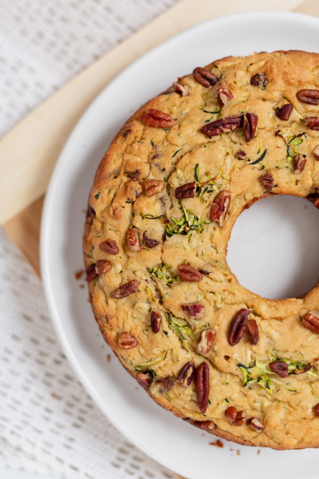Vous pouvez conserver une petite quantité de pacanes et de courgettes râpées pour déposer sur le dessus du pain avant de l’enfourner.