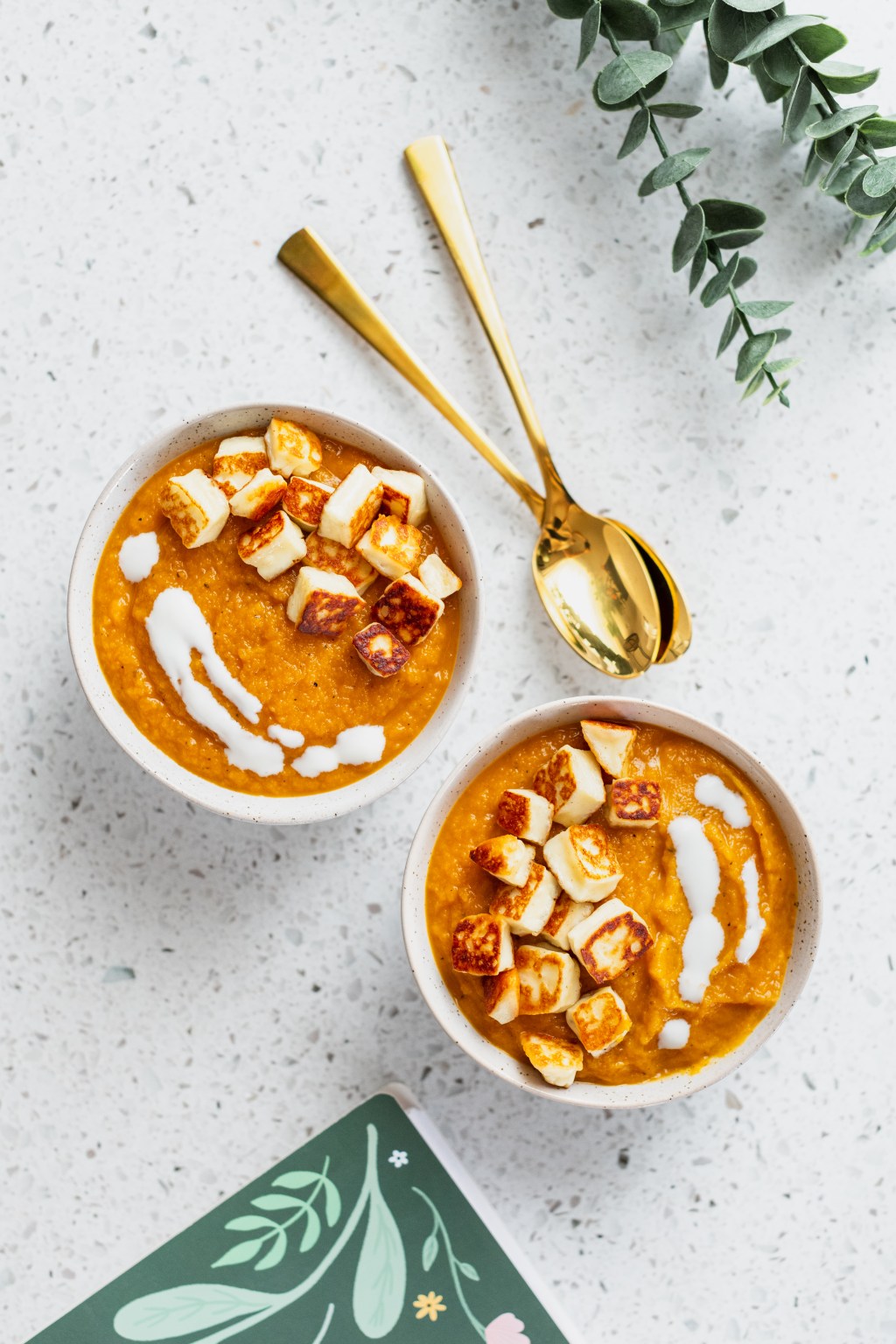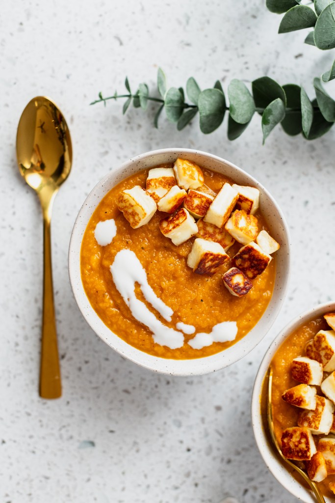 Aujourd’hui, je vous propose une recette de potage de carottes rôties au four, poires et fromage Halloumi grillé. Un vrai délice!