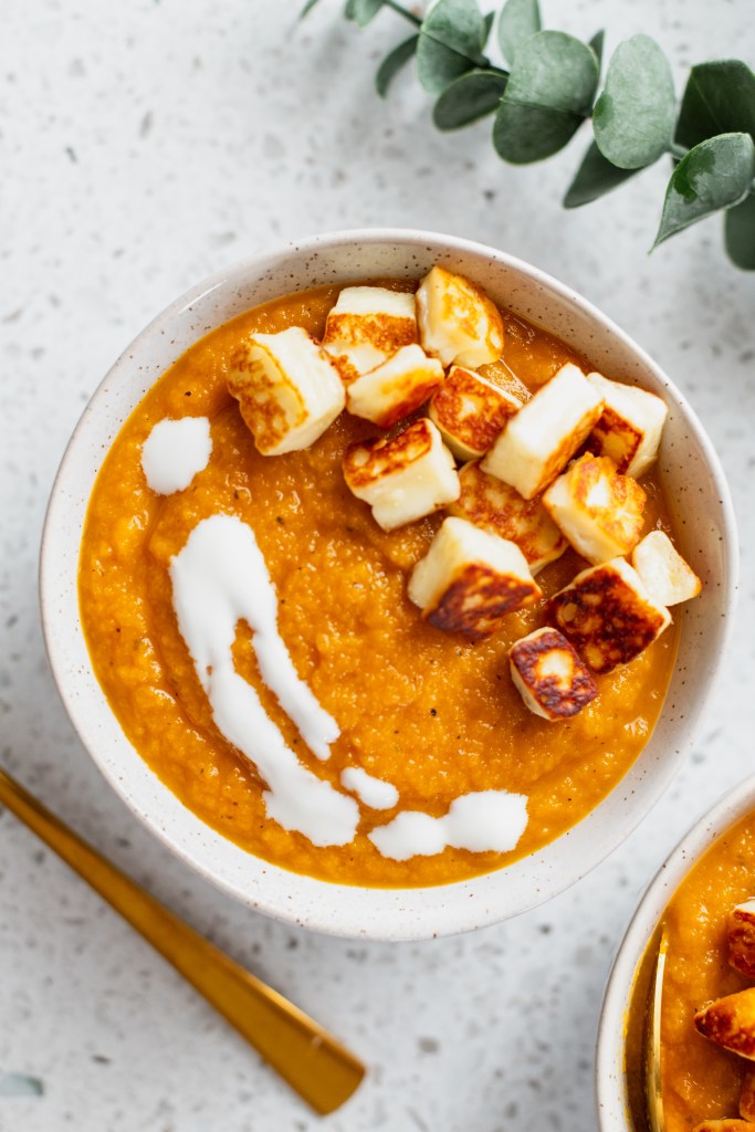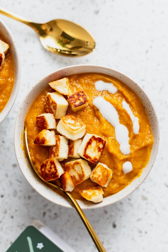 Faites dorer deux tranches de fromage Halloumi coupées en petits cubes et déposez sur le dessus de votre potage avant de servir.