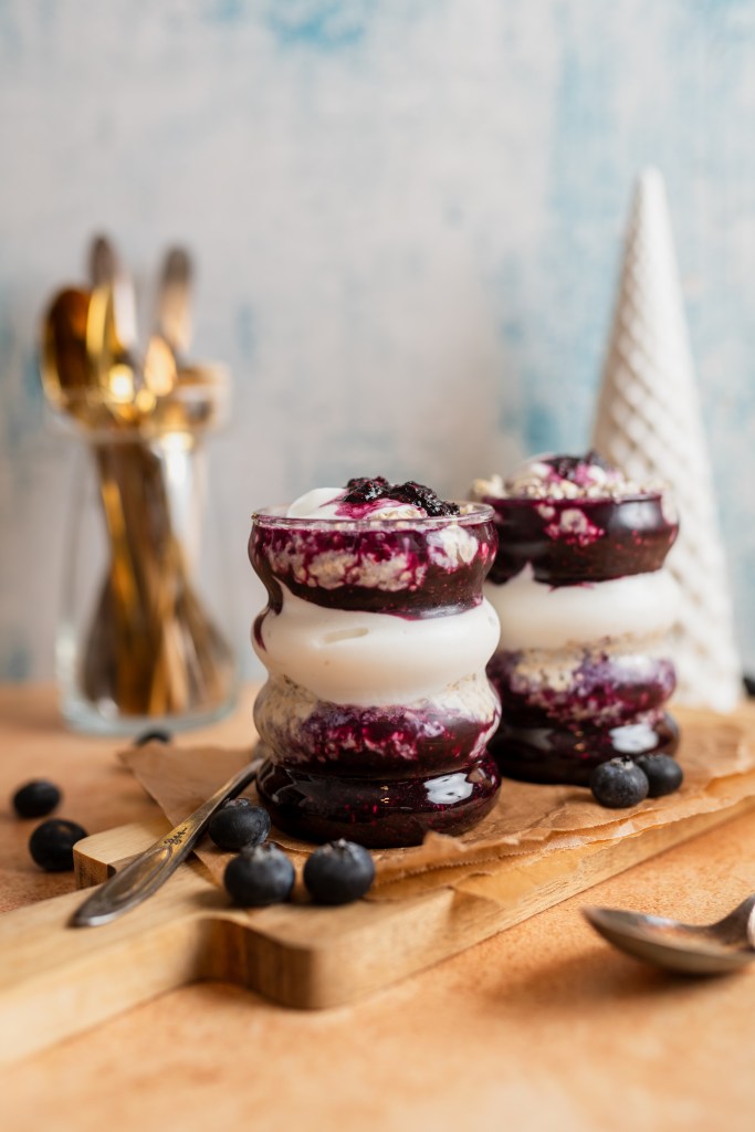 Assembler les contenants (verre ou bol) de gruau overnight à la purée de bleuets en alternant les 3 mélanges en faisant des étages de purée, gruau et yogourt. Donne 2 portions et se conserve au réfrigérateur pendant 3 jours.