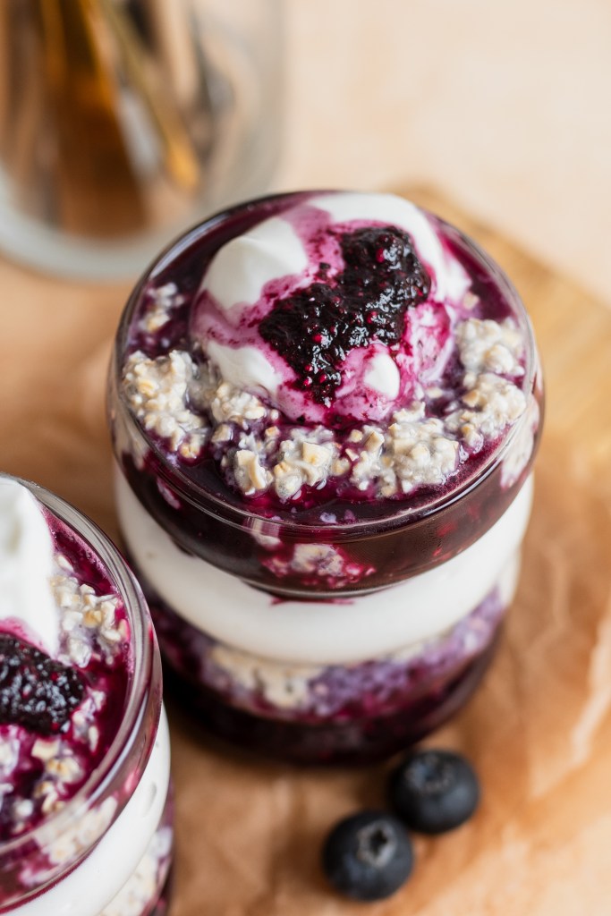 Mon autre petit déjeuner favori est le gruau overnight et j’en ai fait une version à la purée de bleuets, citron et pavot. Que vous ayez des bleuets frais sous la main ou des bleuet surgelés, les deux fonctionnent.